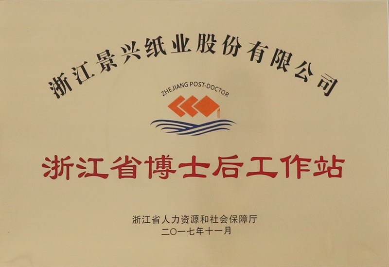 2017.04.景興紙業博士後(hou)工(gong)作(zuò)站通(tong)過(guo)浙江(jiang)省博士工(gong)作(zuò)站審批(pi),同年(nian)11月獲得浙江(jiang)省人(ren)力(li)資(zi)源咊(he)社(she))會保障跼(ju)授(shou)牌。