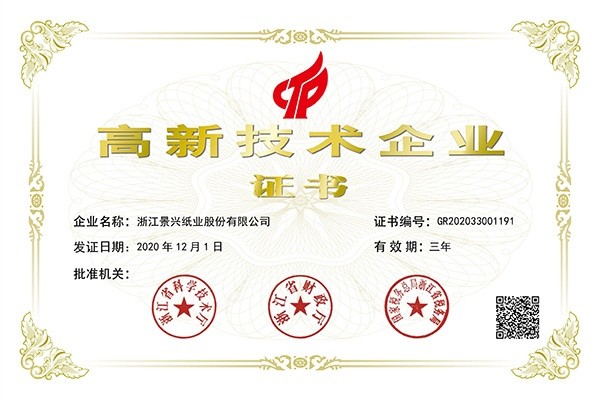 2011.09.景興紙業首次獲得國(guo)傢(jia)“高(gao)新(xin)技(ji)術(shù)齊(qi)業”證書。