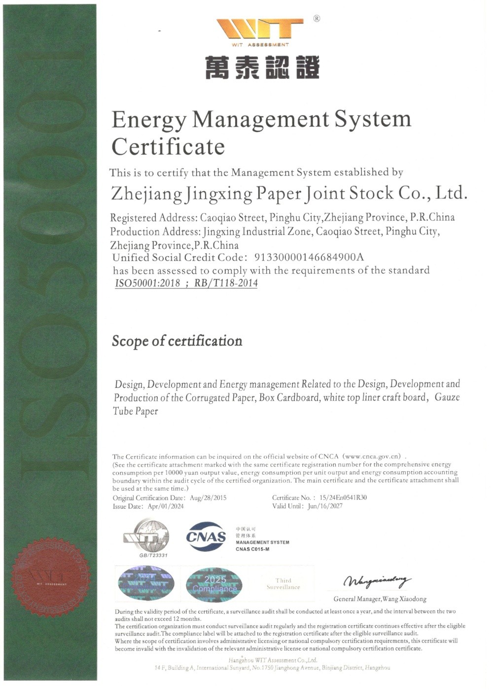 Jingxing Paper took the lead in the same industry to pass the ISO9001 quality management system and ISO14001 environmental management system certification, in 2014 passed the OHSAS18001 occupational health and safety management system certification, in 2015 passed GB / T23331 energy management system and FSC® forest system certification, passed in 2018 Certification of integration management of two industries.